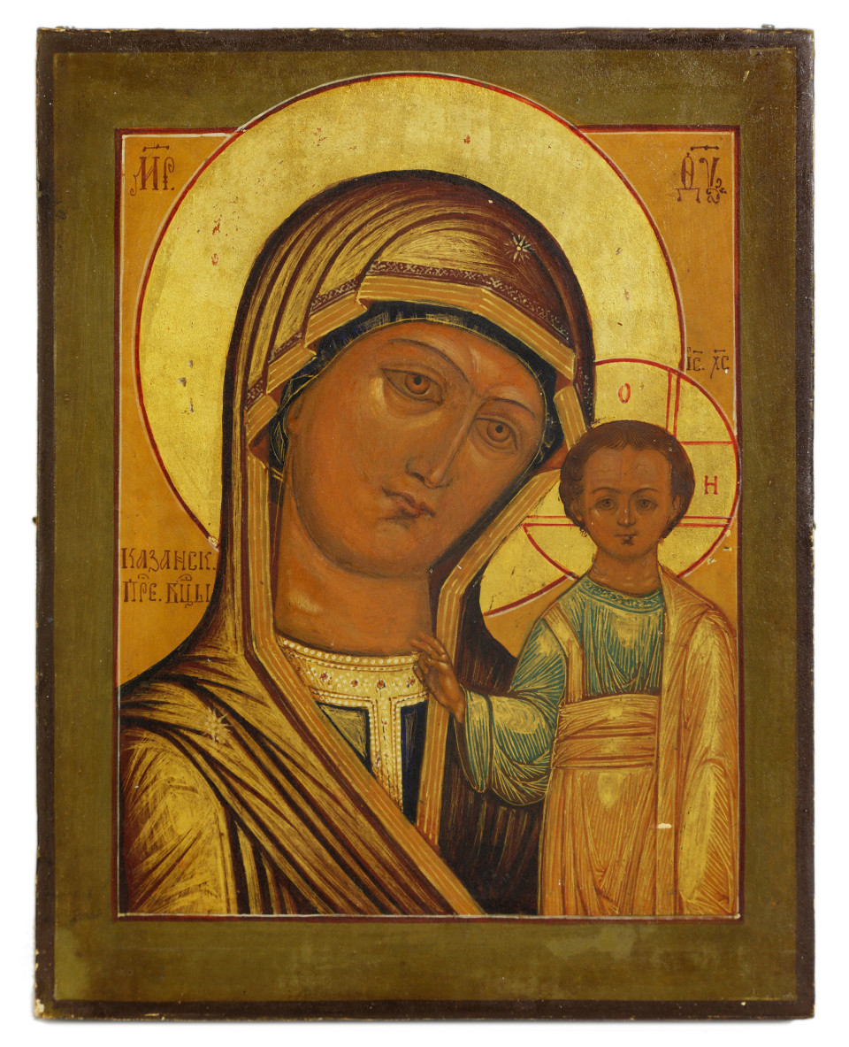 Ikona - Matka Boska Kazańska, tempera, złoto, deska cyprysowa, wym. 22,5 x 17,5 cm, Rosja, Moskwa, XIX w.