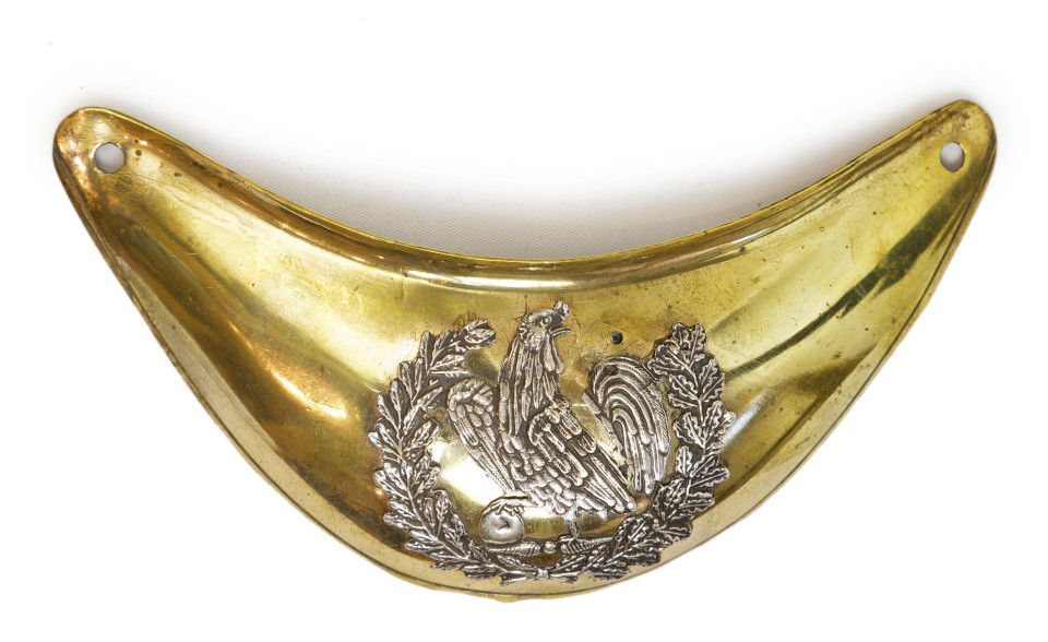 Ryngraf oficera piechoty liniowej, w kształcie półksiężyca, mosiądz złocony, z posrebrzaną aplikacją mosiężną: kogut gallijski stojący na wiązce liktorskiej, otoczony wieńcem mieszanym (z lewej liście lauru, z prawej dębu), wym. 16 x 6,5 cm, II Republika Francuska, 1848