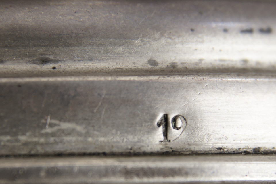 Pucharek srebrny pr. 12 łut, repusowany i grawerowany, czara i nodus zdobione ornamentem roślinno - geometrycznym, na jednym z dekoracyjnych medalionów czary grawerowana inskrypcja: "R.J. d. 12. t. Juli 1857", okrągła stopa kanelowana, waga 83g, wymiary: śr. podstawy - 7 cm, wys. - 14 cm, Cesarstwo Niemieckie, lata 50. XIX w.