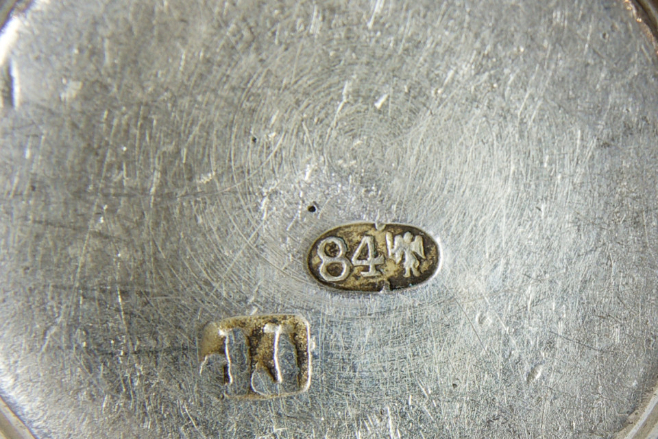 Kubek srebrny pr 84 Rosja, grawerowany (medaliony, architektura, ornament roślinno - geometryczny), waga 18 g, wys. - 4,5 cm, złotnik nieznany - imiennik "GR" pisane cyrylicą, Kijów, ostatnia ćwierć XIX w.